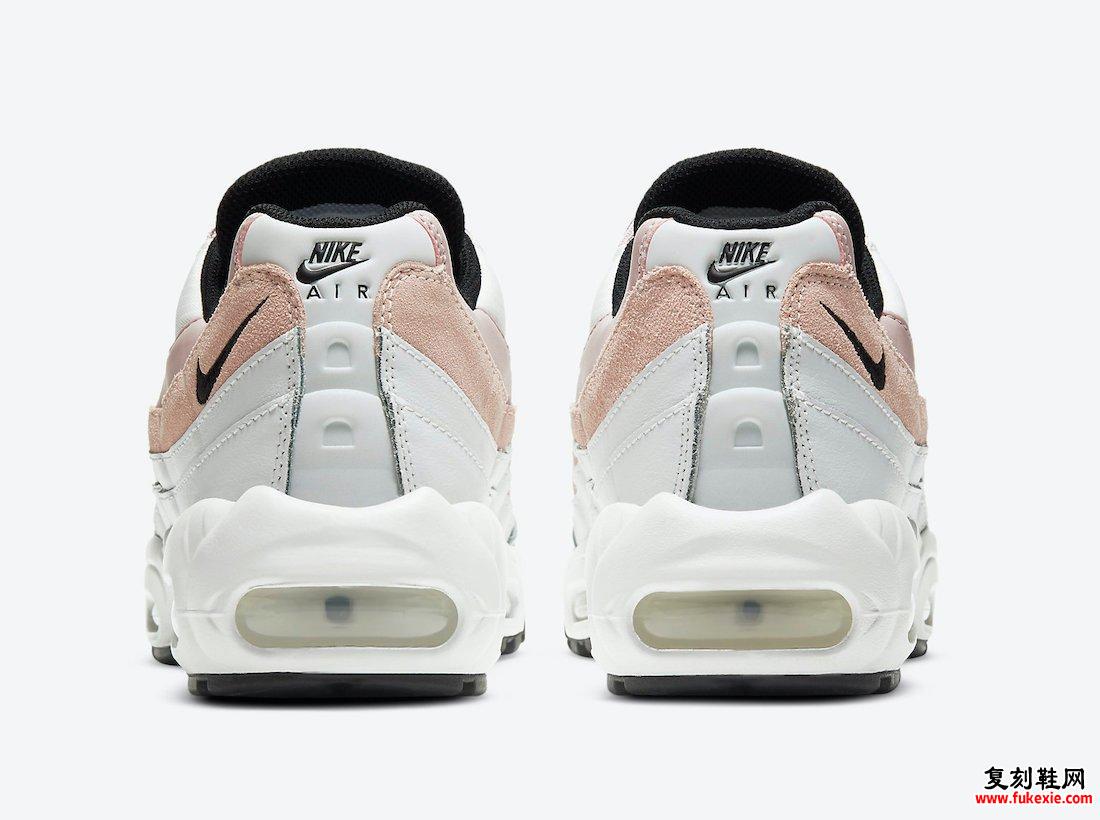 仔细观察,这款Nike Air Max 95穿着浅色。由网眼,皮革,绒面革和缎面制成。鞋帮通常是白色,与浅粉红色搭配穿过整个面板,并在花边环上暗示。接下来,Black填充了Swoosh,衬板和舌头品牌。最后是白色中底,透明Air Max鞋和黑色橡胶外底。