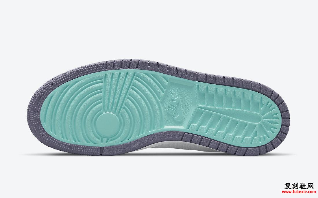 穿着白色,破晓和热带风情配色方案。这款Air Jordan 1 Zoom Comfort鞋面为白色网眼,浅青色衣领和紫色鞋舌。
