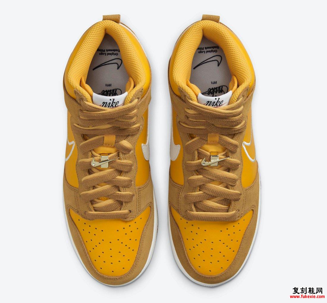 这款Nike Dunk High混合了大学金色、白色和浅棕色胶。大学金皮革覆盖鞋面,覆盖层上有绒面革。