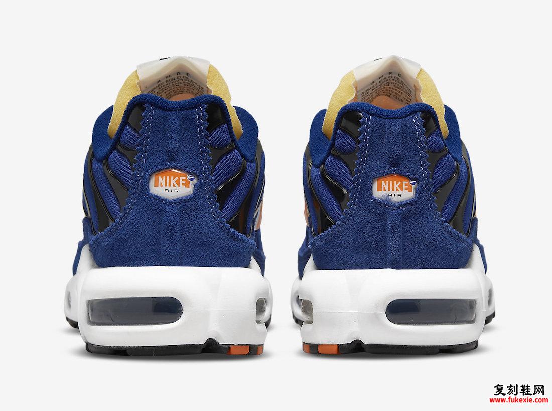 黑色、橙色和深宝蓝色配色方案。这款Nike Air Max Plus采用宝蓝色底座,黑色笼罩覆层突出橙色对比色。
