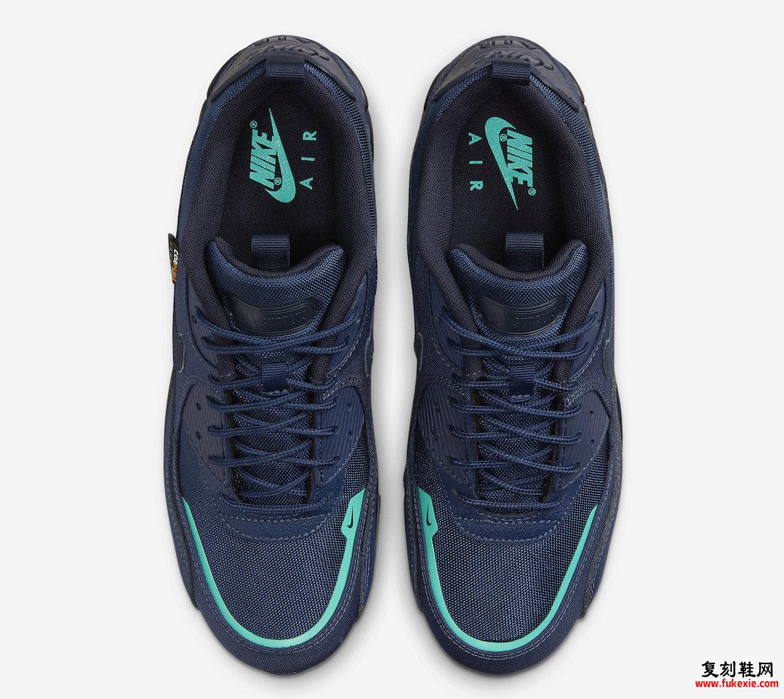 午夜海军、黑曜石和超级翡翠配色方案。此款Nike Air Max 90采用海军蓝和黑曜石鞋面,采用耐用的 Cordura 面料制成。