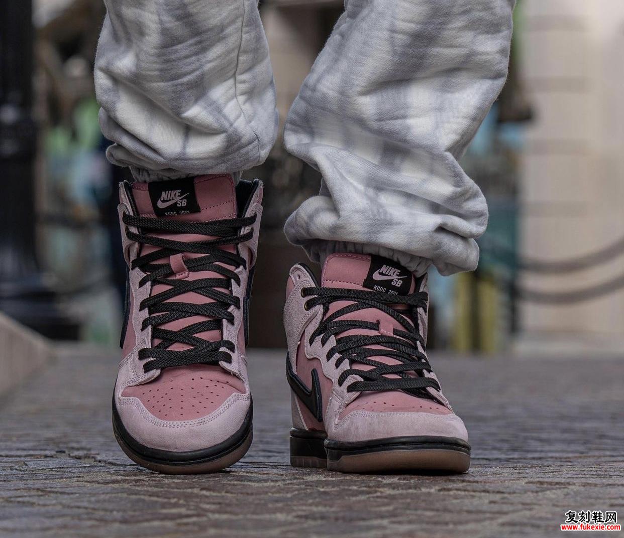 Nike SB Dunk High 的这款产品采用粉红色绒面革鞋底,覆盖层使用较浅的粉红色调。