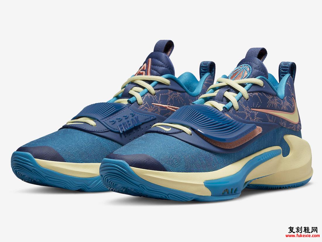 Nike Zoom Freak 3的这款产品采用蓝色、粉色和淡黄色配色,具有混合纹理和图案。