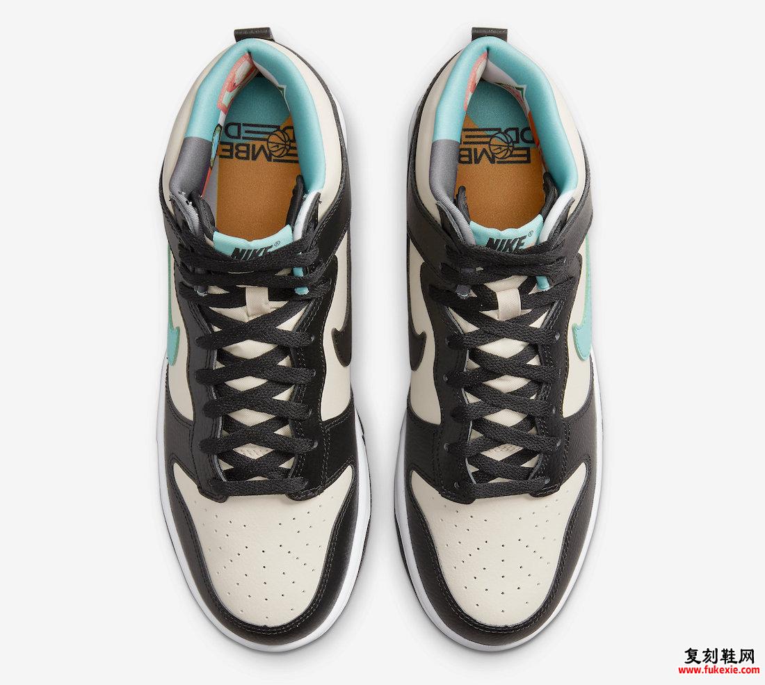 此款Nike Dunk High采用全皮革材质打造,米色底座搭配黑色覆层、绿松石色装饰和不匹配的 Swooshes。