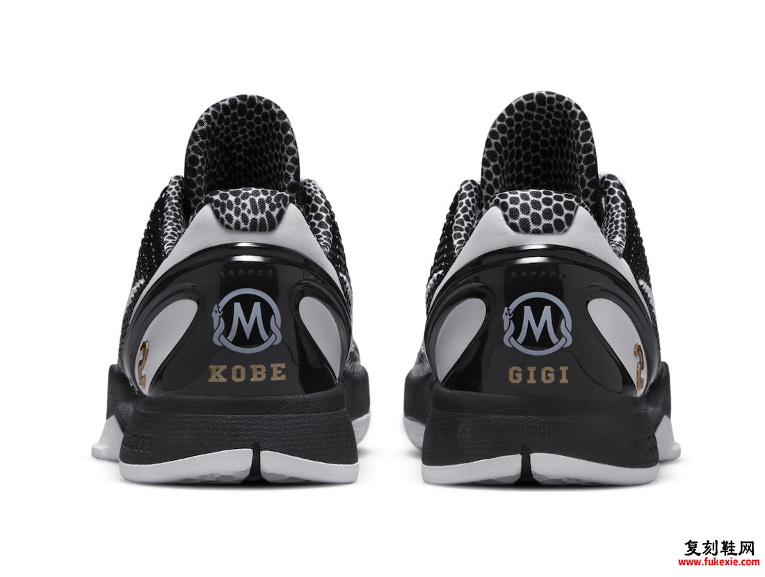 蛇皮印花也用于内衬。突出这双鞋的是后跟上的 Mamba & Mambacita Sports Foundation 标志,左右鞋分别印有科比和吉吉的名字。Gigi 的数字“2”在鞋跟外侧印有金色,完成了设计。