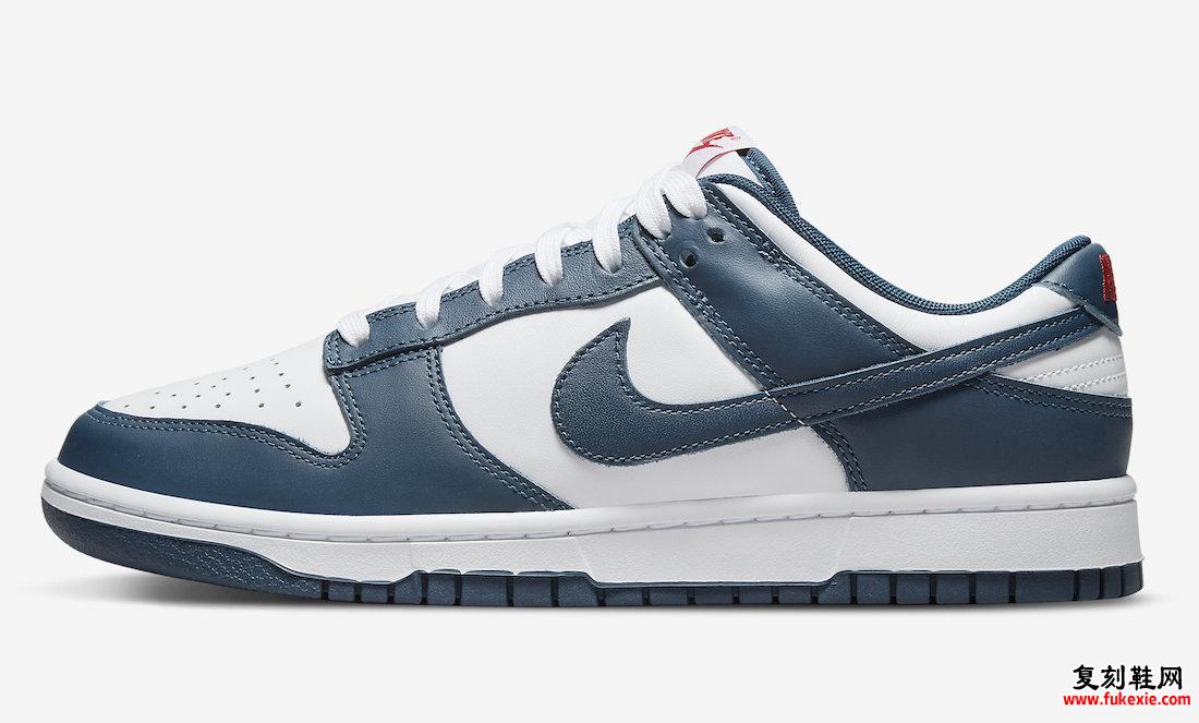 穿着缬草蓝、白色和大学红配色方案。此款Nike Dunk Low采用白色皮革鞋底,搭配缬草蓝覆盖层、Swooshes、鞋垫和橡胶外底。