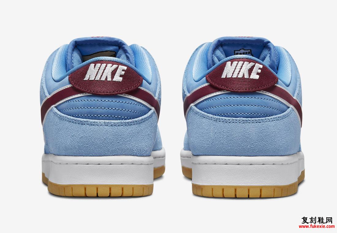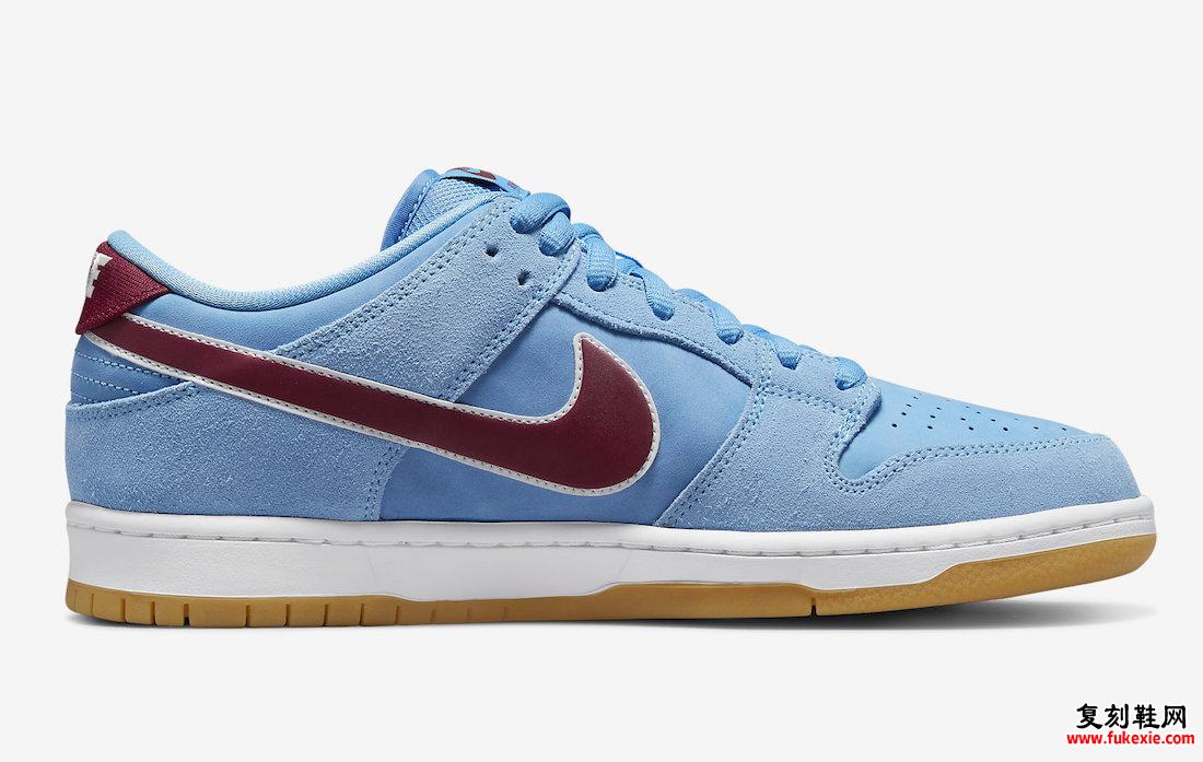 身着 Valor Blue、Team Maroon、White 和 Gum Light Brown 配色方案。此款Nike SB Dunk Low采用 Valor Blue 绒面革鞋面搭配 Team Maroon Swooshes 和白色皮革饰边。