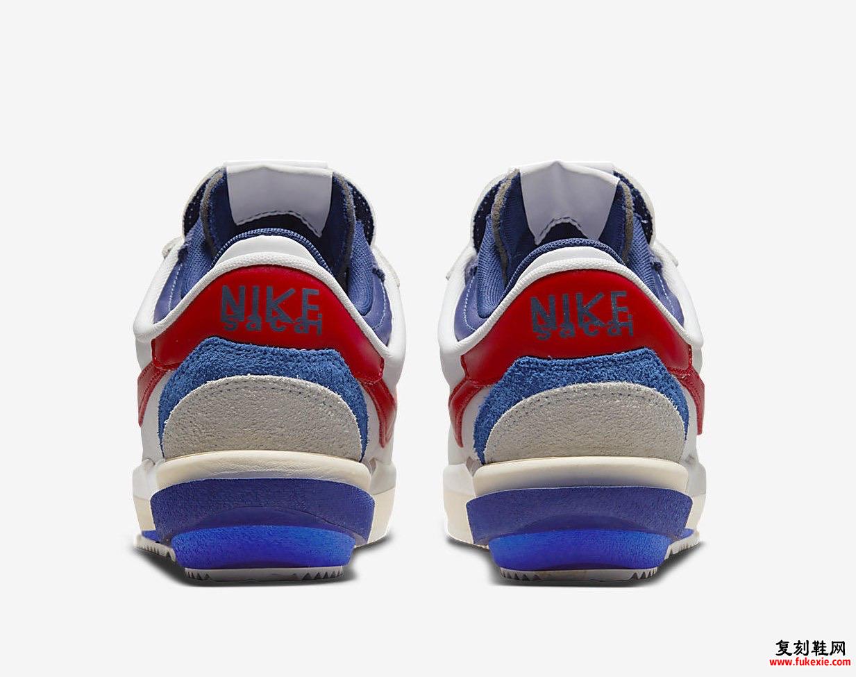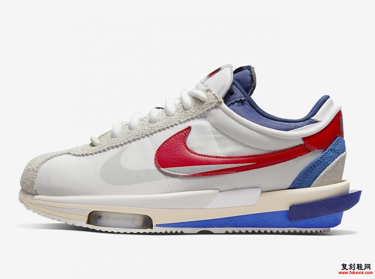 Sacai x Nike Cortez采用OG 拼色设计,白色皮革底座搭配灰色绒面革覆层,搭配红色和蓝色对比色。