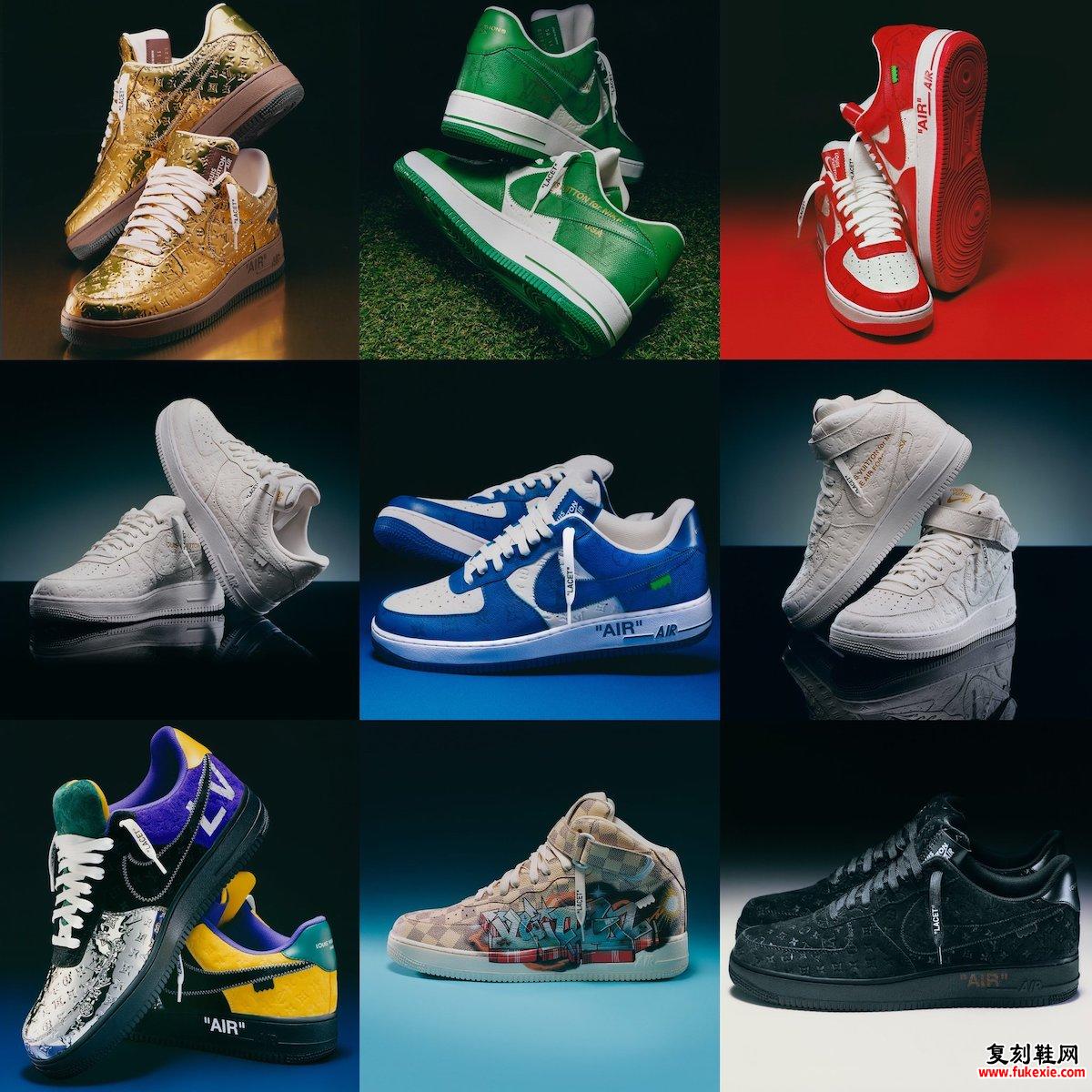 这些 LV x Nike Air Force 1配色包括蓝色、红色和绿色的几种双色调款式、色调黑色和白色配色方案以及多色对和金属金色产品。