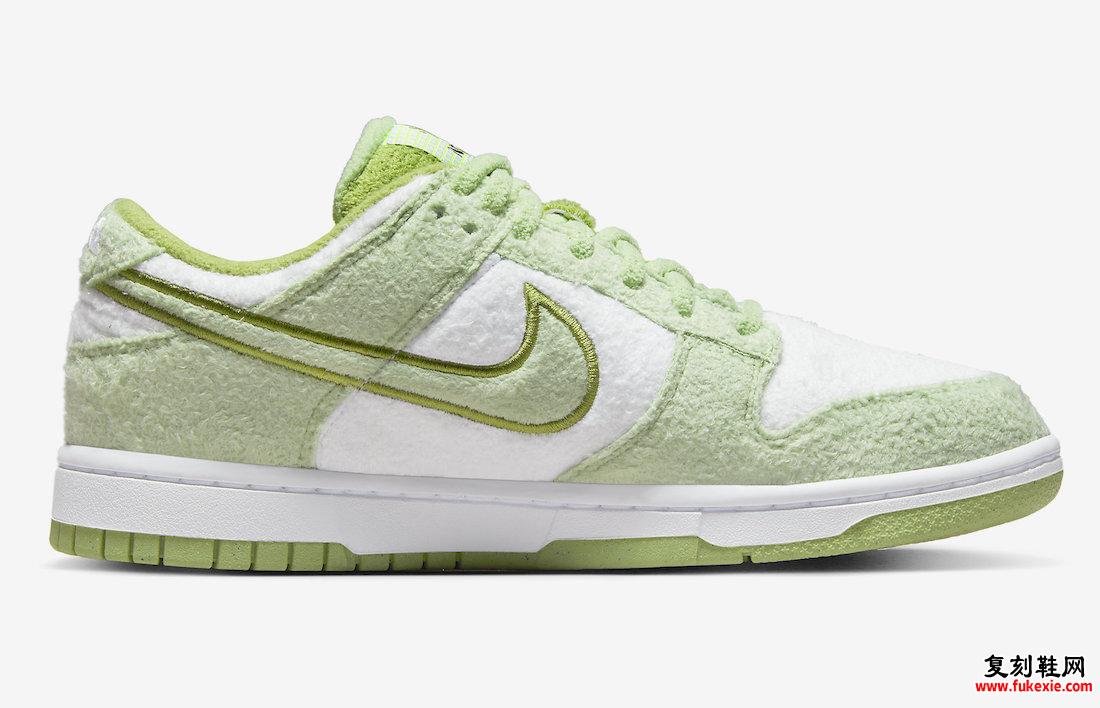 Nike Dunk Low的这款产品完全采用蓬松的抓绒材料制成,具有白色底座和绿色覆盖层。