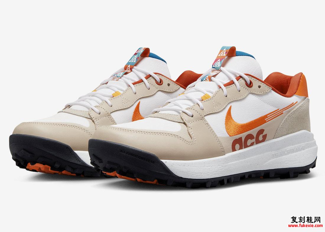 白色、沙浪和安全橙色配色方案。Nike ACG Lowcate的这款产品采用网眼、皮革和绒面革材料混合制成。