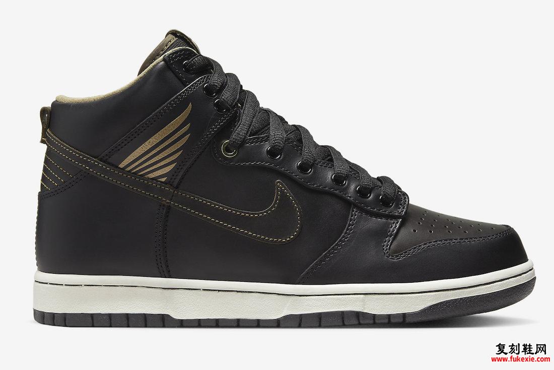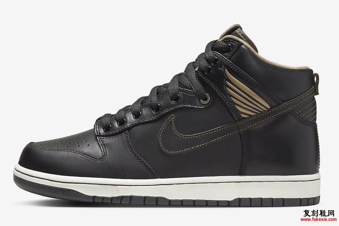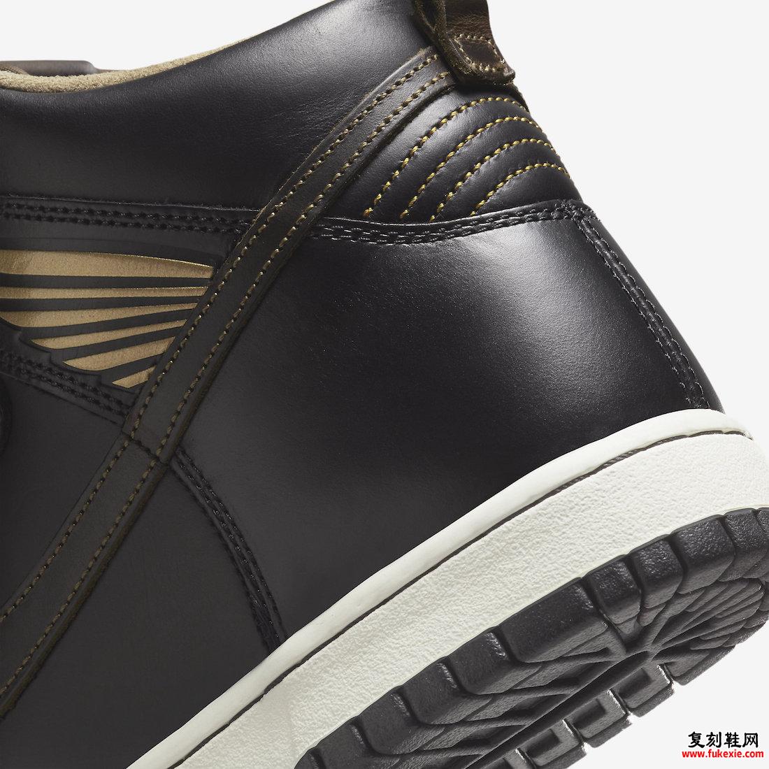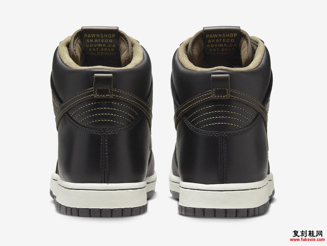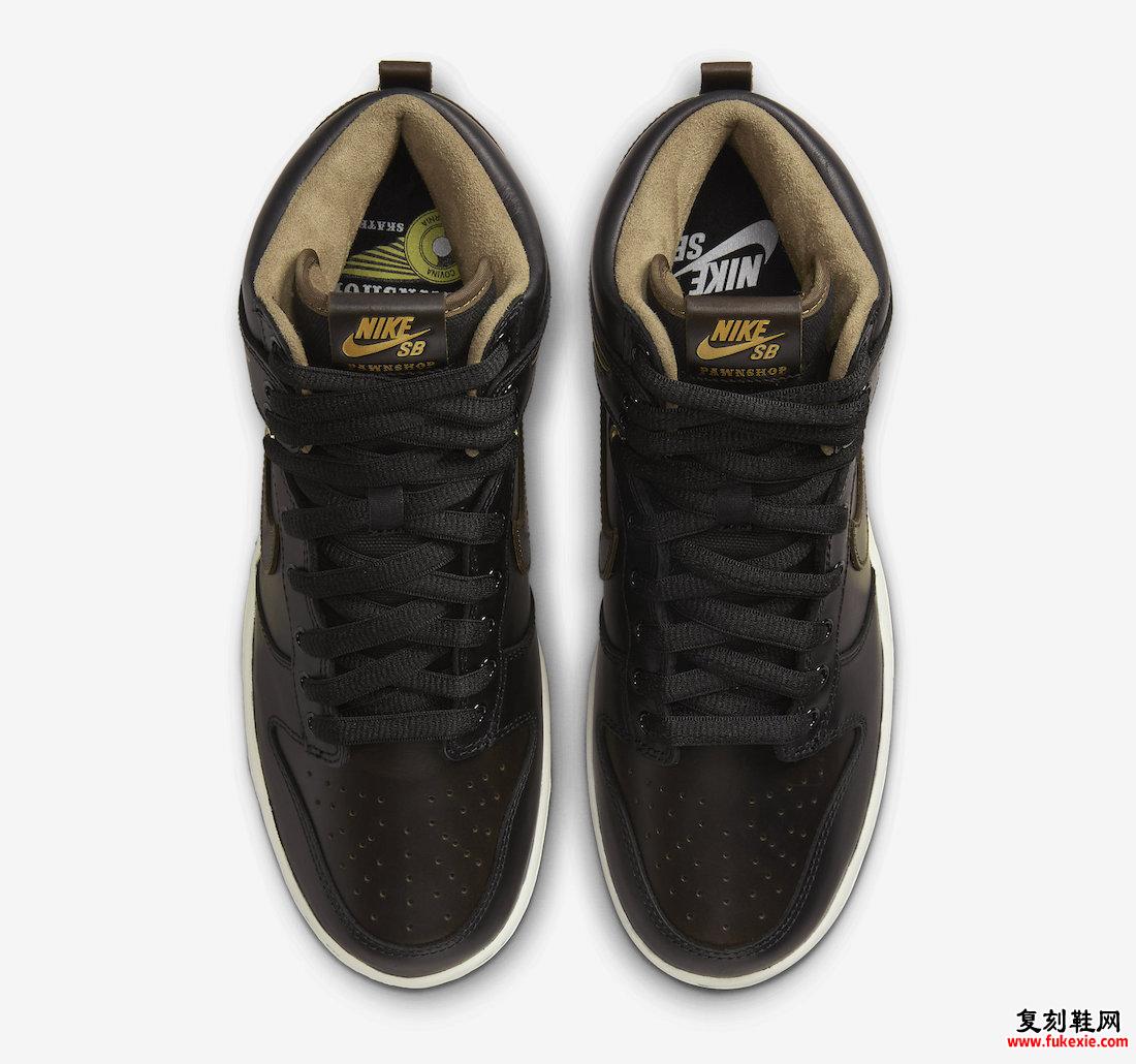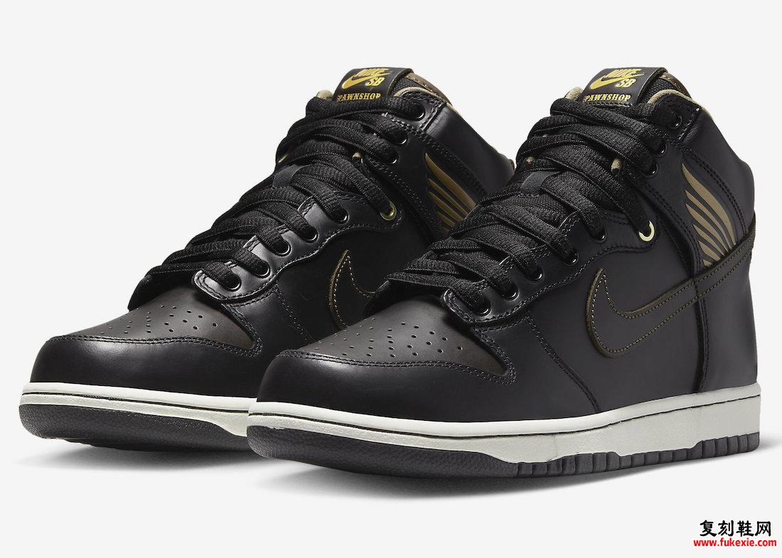 Pawnshop x Nike SB Dunk High的这款产品采用黑色、棕色和金色的混合颜色,采用优质皮革底(可能会磨损)、麂皮衬里和网眼鞋舌。