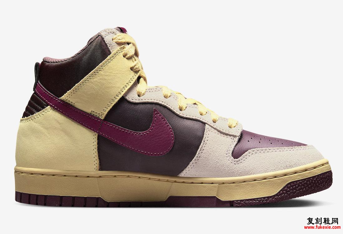 雪花石膏、紫檀木、大地色和夜栗色配色方案。这款Nike Dunk High鞋款采用皮革、绒面革和网眼材料混合制成。'85 刺绣在老式中底上的外侧鞋跟上完成了设计。