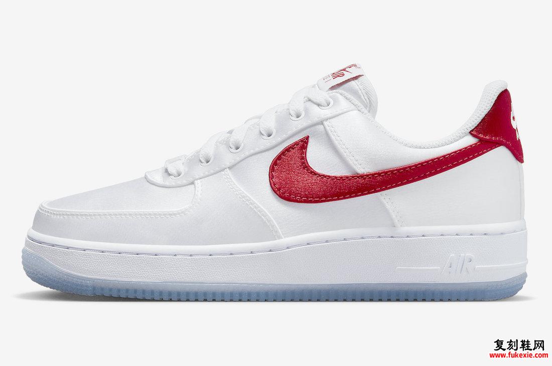 将于未来几个月在指定零售商和 Nike.com 发布的女款Nike Air Force 1 Low Satin“White/Red” 。
