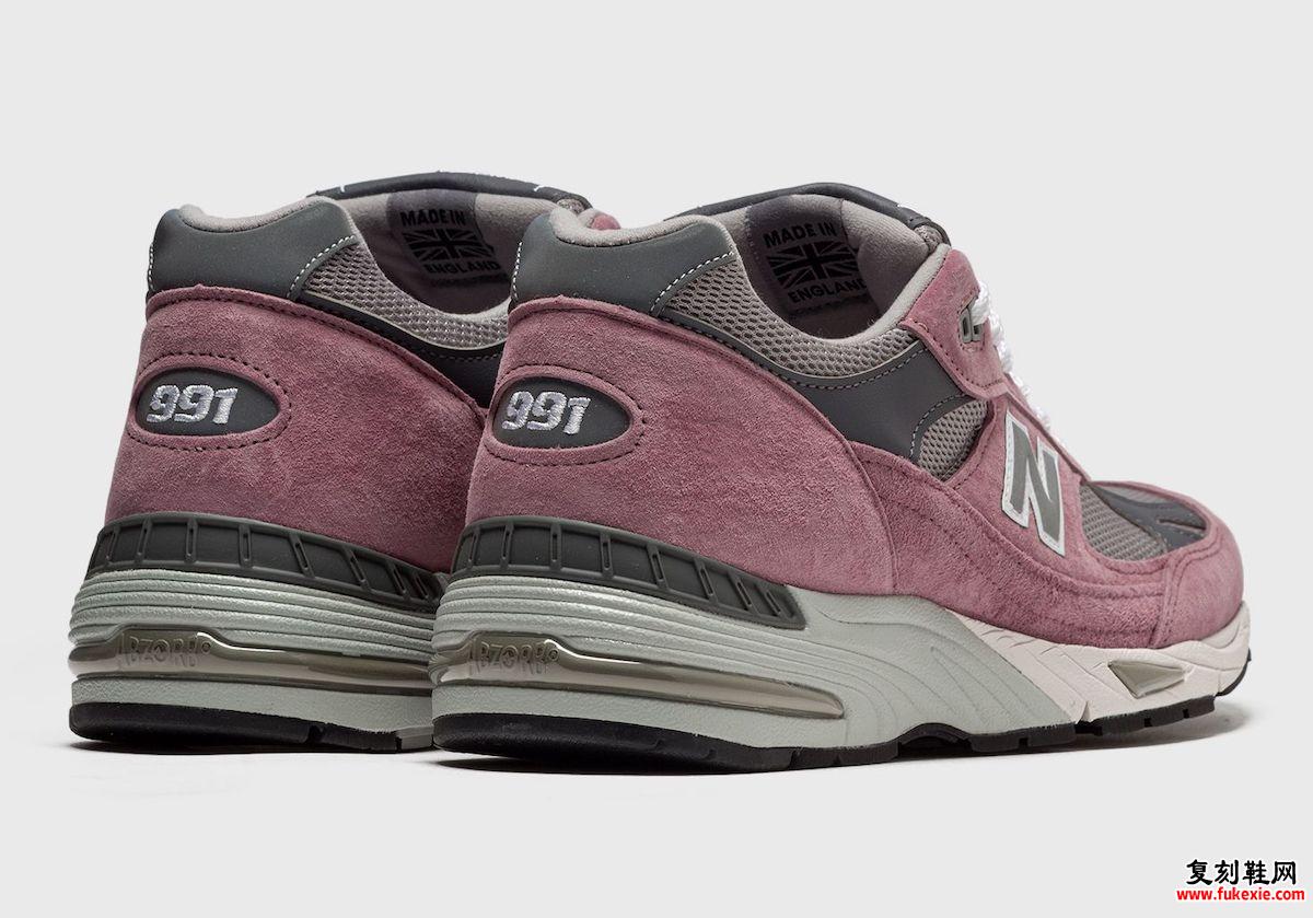 New Balance 991的这款产品采用灰色网眼底和粉色猪皮绒面革覆盖层。