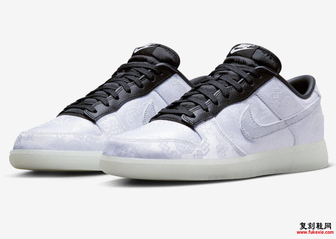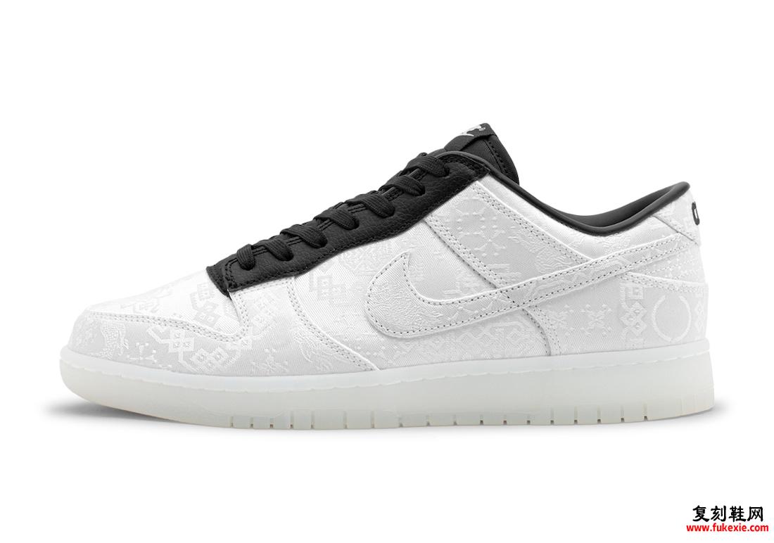 虽然合作背后的灵感仍然未知,但 Clot x Fragment x Nike Dunk Low采用白色撕裂丝绸鞋面,黑色皮革鞋眼和半透明外底衬里。
