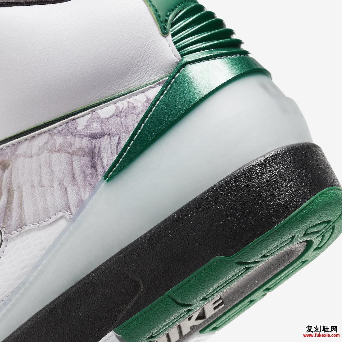 白色、孔雀石色和黑色配色方案。Air Jordan 2的这款产品采用白色皮革鞋面,侧面板类似于一对覆盖着羽毛印花的翅膀。