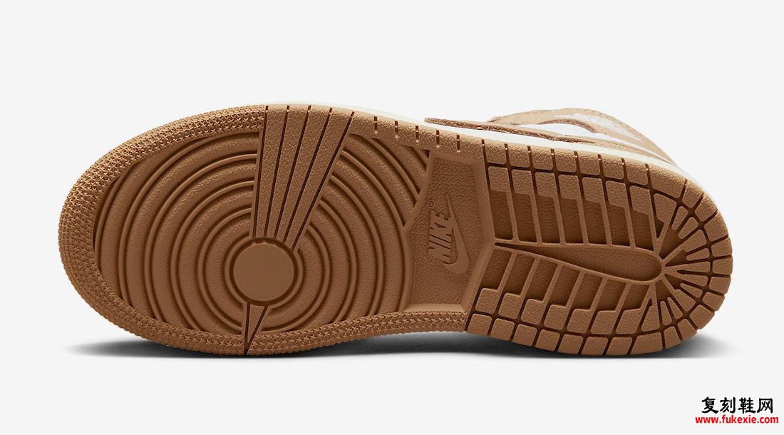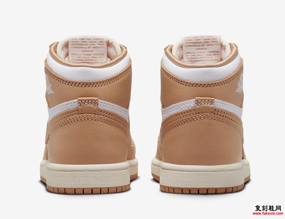 Praline、White 和 Sail 配色方案。Air Jordan 1的这款产品采用优质皮革、网眼鞋舌和缎面衬里制成,散发出奢华的气息。