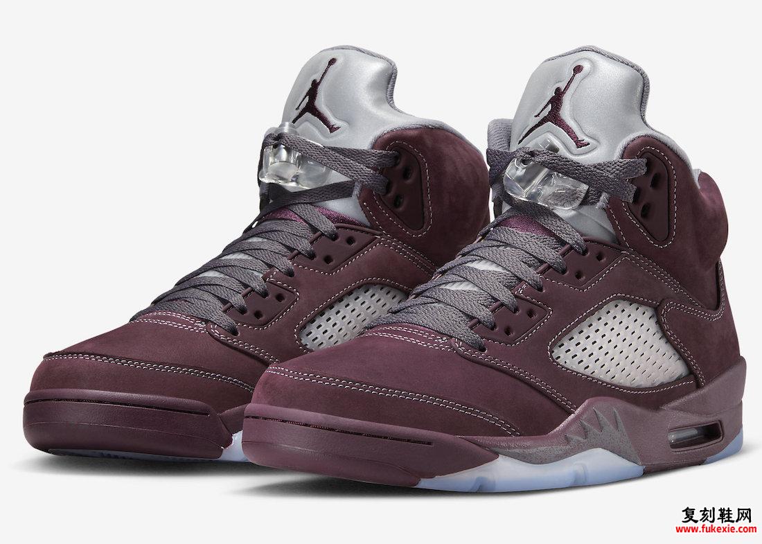 采用深酒红色、浅石墨色和银色配色方案。这款Air Jordan 5的外观与其最初版本一模一样,采用酒红色绒面革鞋面、银色鞋舌和灰色点缀。
