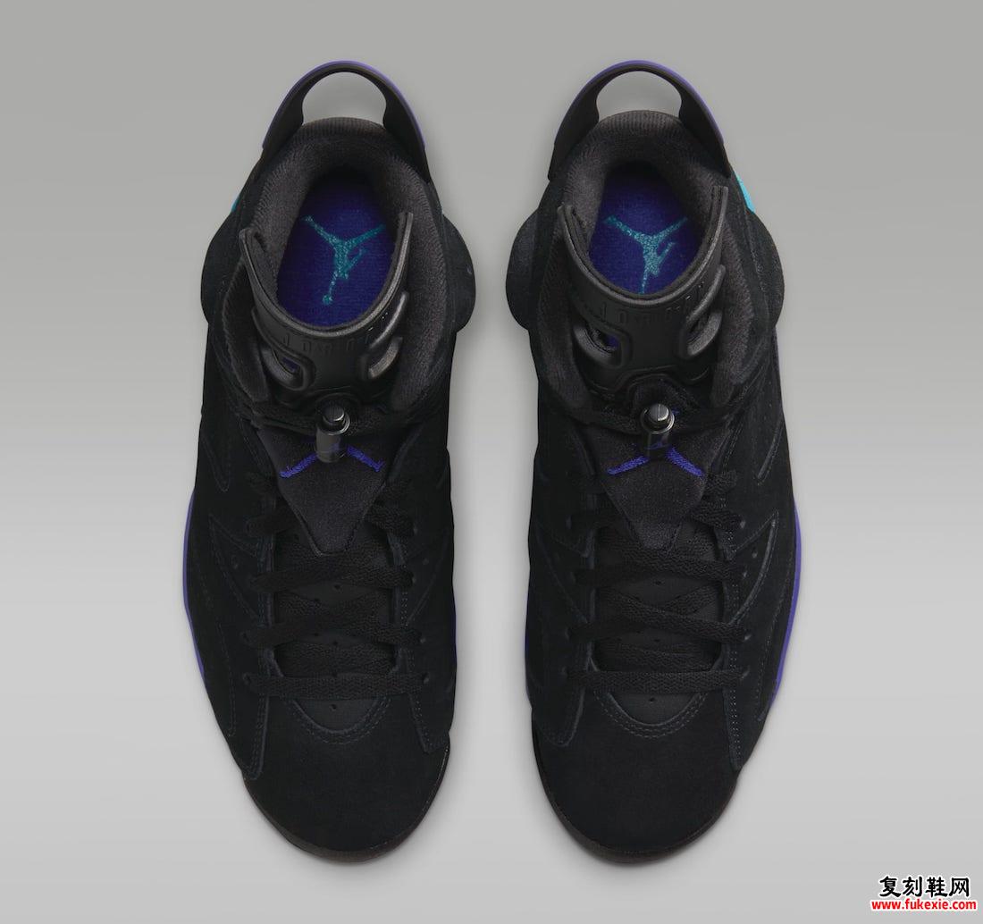 这款Air Jordan 6版本采用时尚的黑色、Bright Concord 和 Aquatone 色调,与2010 年的版本非常相似。该鞋采用黑色正绒面革鞋面,Jumpman 徽标、中底、后跟扰流板和鞋垫上饰有 Concord 和 Aquatone 装饰。这些添加物散发出明显的“Aqua”风格。最后的点缀是透明、冰冷的外底,使设计更加圆润。这一非凡的版本将有多种尺寸可供选择,并采用独特的包装。