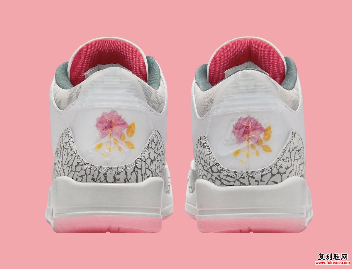 这款单品采用全白色皮革鞋面,鞋头和鞋跟饰有灰色大象印花。鞋舌上绣有火红色的 Jumpman 标志。其他值得注意的细节包括挡泥板、蕾丝领和脚踝上的花卉图案。这些区域展示了一幅图案画布,上面装饰着褪色的玫瑰茎图像。材料和复杂设计的混合为经典廓形增添了独特的外观。