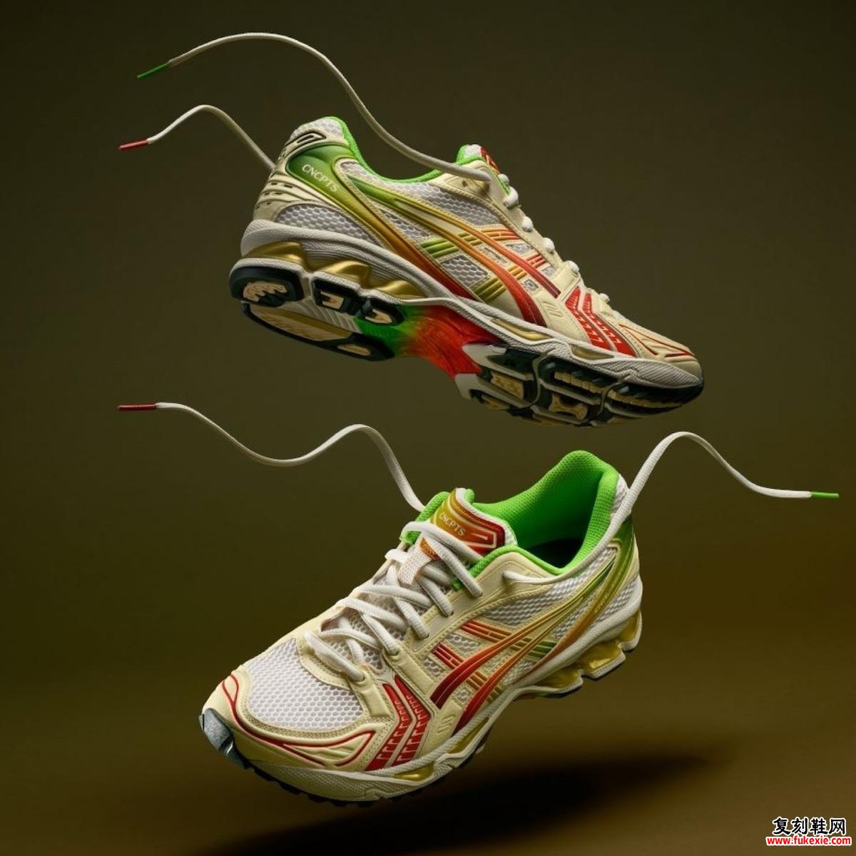 Concepts携另一项激动人心的合作回归,与 ASICS 合作推出了大胆的“Out of Office”配色的Gel-Kayano 14 。这个新版本强调了个人在精神上和创造力上充电的重要性。该设计具有从红色到绿色的引人注目的渐变,象征着充电的过程。鞋跟和口音上的霓虹绿色亮点代表着充满电的状态,完成了视觉故事。