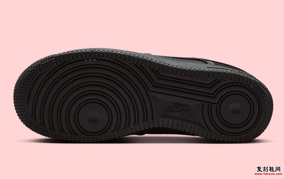 本次设计最大亮点在于全黑色缎面鞋面的运用。相较于传统皮革或麂皮,缎面材质呈现出丝绸般的光泽感,在光线折射下形成细腻的明暗变化,大幅提升鞋款的精致度。鞋面保留了Air Force 1 Low标志性的冲孔设计与缝线细节,确保经典轮廓的辨识度。 - 配色对比:柔美点缀打破沉闷基调