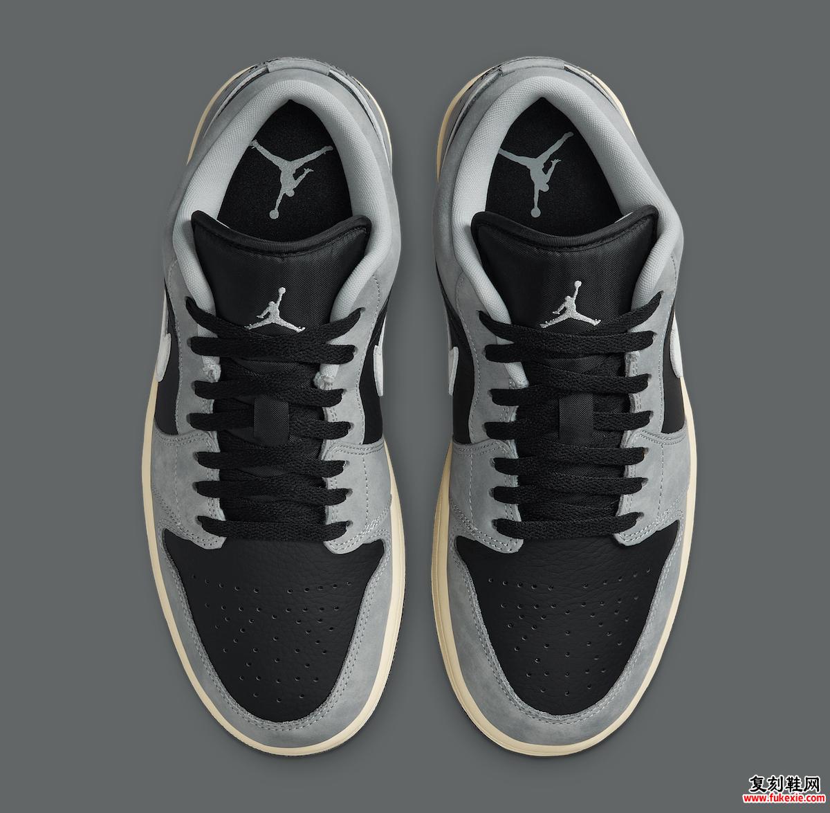 延续Air Jordan 1 Low标志性低帮设计,鞋身线条简洁流畅,兼顾运动感与日常穿搭需求。黑色底座面板 奠定整体沉稳基调,浅烟灰色绒面革覆盖前掌、鞋眼及后跟区域,通过材质对比提升层次感。 - 细节雕琢