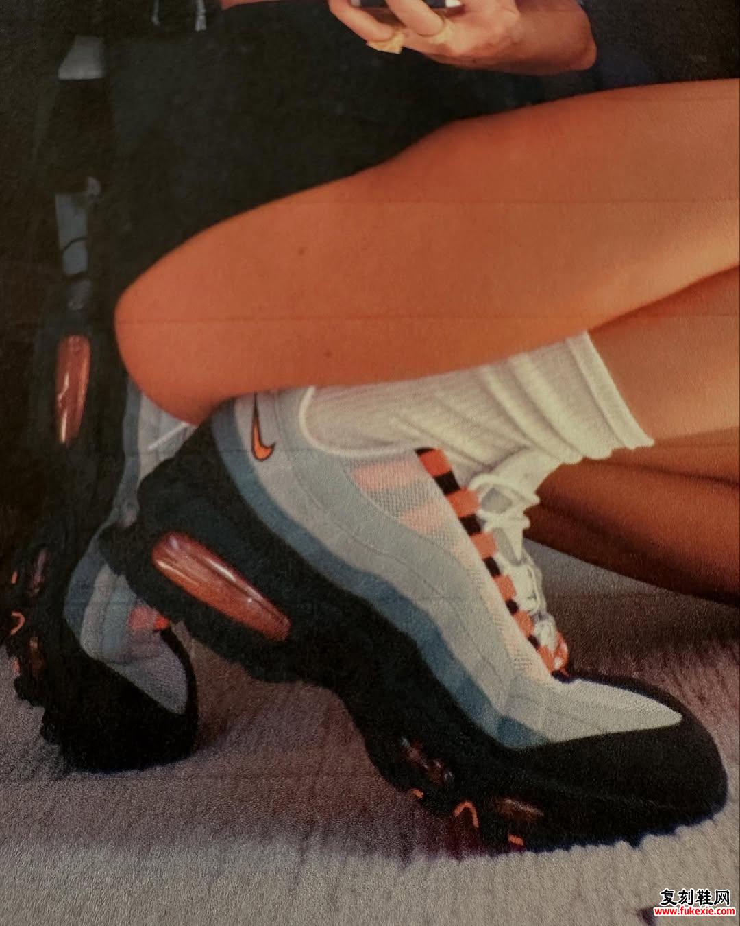 Air Max 95由设计师Sergio Lozano于1995年打造,其分层渐变鞋面灵感源于人体肌肉与骨骼结构。此次复刻的“Bright Mandarin”配色最初发布于2011年,以白色网眼为基底,过渡至深灰色麂皮,模拟肌肉纹理的层次感。鞋带孔、鞋舌标签及迷你Swoosh处点缀的亮橘色,成为视觉焦点。- 关键设计升级: