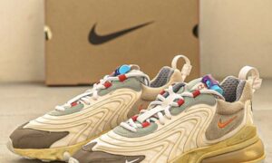说唱歌手·斯科特再度联乘Travis Scott x Nike Air Max 270 React ENG"Cactus Jack" TS网织黄深棕橙波纹瑞亚赛车系列 后...